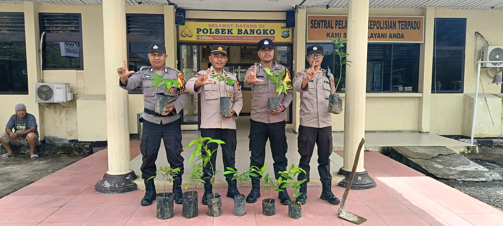 Penanaman dilaksanakan oleh Kapolsek Bangko AKP Buyung Kardinal,.SH.MH, Kanit Binmas IPTU Yatim, Pers Bhabinkamtibmas , Kasium dengan jumlah 8 Pohon berbagai Jenis yakni, pohon mangga 2 batang,klengkeng 2 batang,jambu 2 batang,matoa 2 batang di halaman kantor Polsek Bangko Kamis 13/112025 sekira pukul 09.00 Wib .