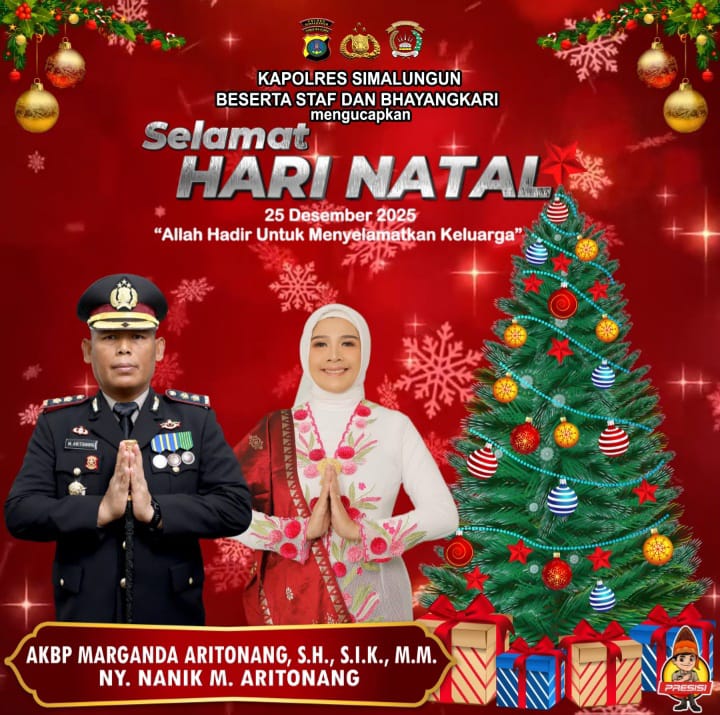 MATAHUKUM.ID/SIMALUNGUN -– Kehangatan dan sukacita Natal 2025 terpancar dari ucapan tulus Kepala Kepolisian Resor Simalungun AKBP Marganda Aritonang, SH, SIK, MM., beserta Ketua Bhayangkari Cabang Simalungun Ny. Nanik M. Aritonang. Mereka bersama seluruh staff dan jajaran Polres Simalungun mengucapkan Selamat Hari Natal 25 Desember 2025 dengan tema penuh makna: “Allah Hadir Untuk Menyelamatkan Keluarga”.