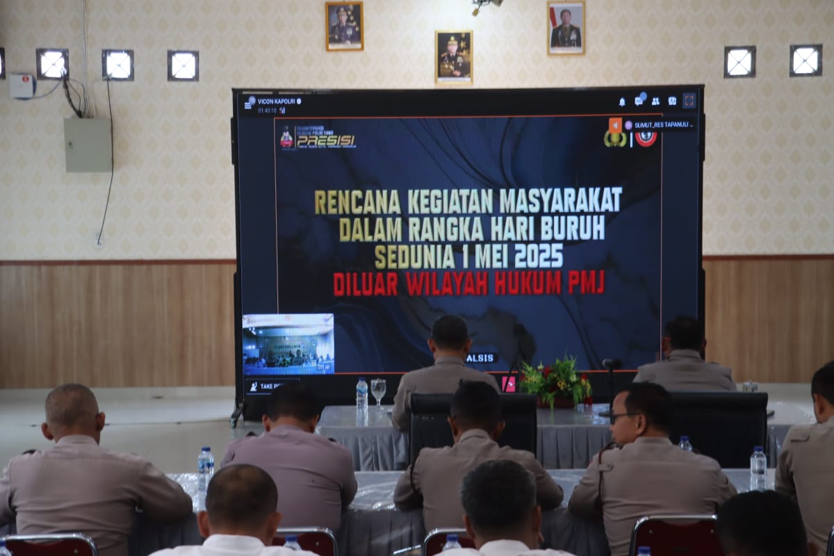 MATAHUKUM.ID/SIMALUNGUN — Kapolres Simalungun AKBP Marganda Aritonang, S.H., S.I.K., M.M., beserta jajaran pejabat utama Polres Simalungun mengikuti arahan langsung dari Kapolri Jenderal Polisi Drs. Listyo Sigit Prabowo, M.Si., dalam rangka Analisis dan Evaluasi (Anev) situasi Kamtibmas terkini menjelang peringatan Hari Buruh Internasional atau May Day. Kegiatan yang diselenggarakan pada Rabu (30/4/2025) ini diikuti secara daring melalui aplikasi Zoom Meeting dari Aula Andar Siahaan, Markas Komando Polres Simalungun.