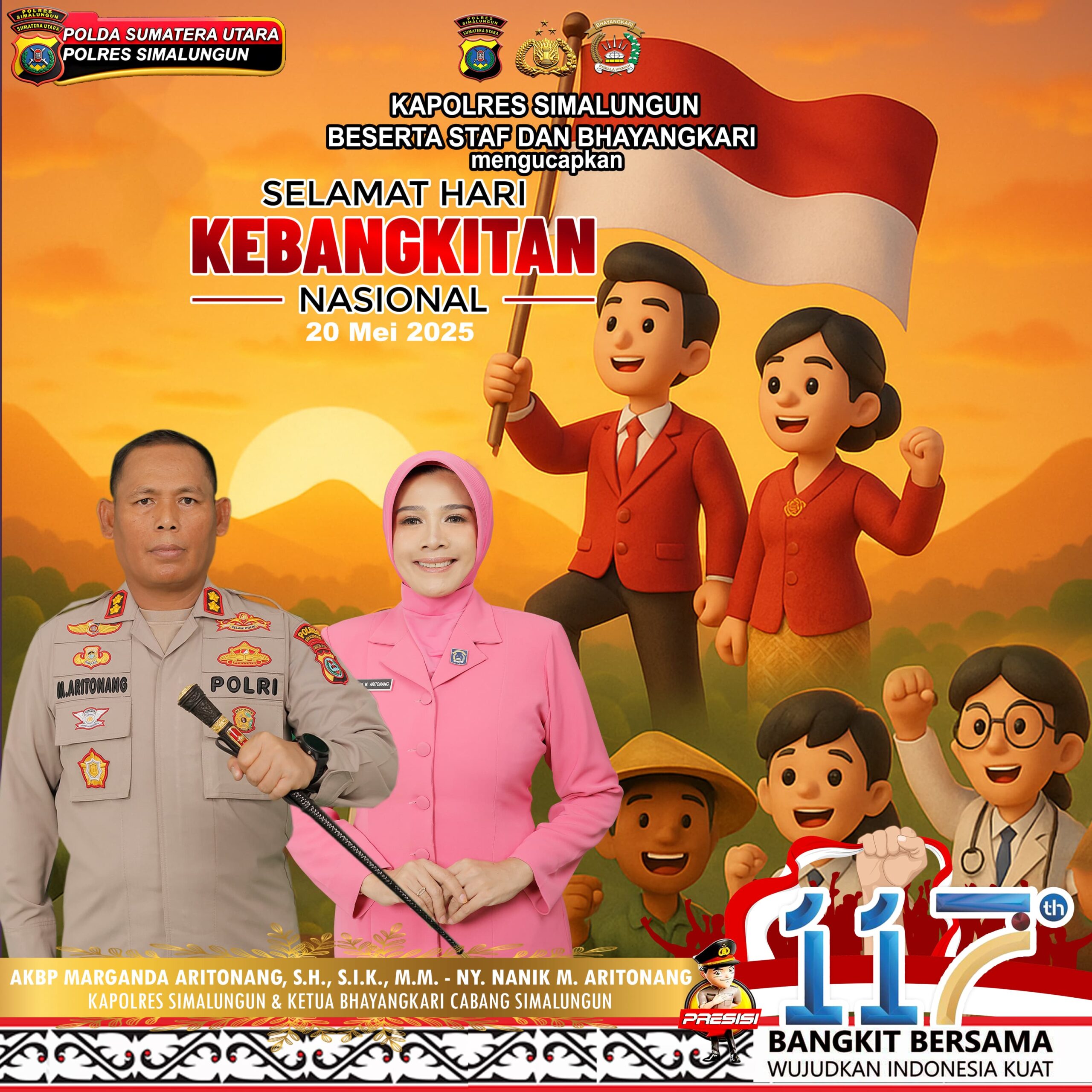Kapolres Simalungun dan Ny. Nanik M. Aritonang selaku Ketua Bhayangkari Cabang Simalungun turut menyampaikan ucapan selamat memperingati Hari Kebangkitan Nasional kepada seluruh masyarakat di wilayah hukum Polres Simalungun.