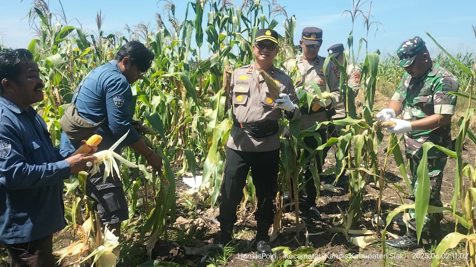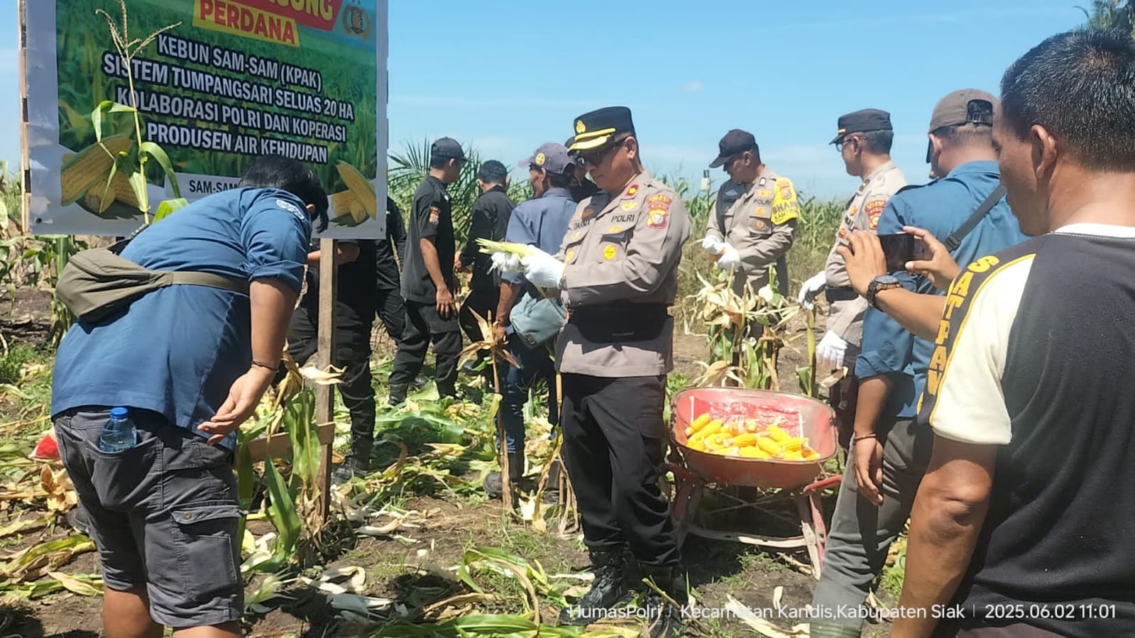 KANDIS – MATAHUKUM.ID – Dalam rangka mendukung program Presiden Republik Indonesia untuk mewujudkan ketahanan pangan nasional, Kapolsek Kandis Kompol Darmawan, SH, MH menghadiri kegiatan panen jagung perdana di lahan milik Koperasi Produsen Air Kehidupan (KPAK), Kampung Sam-Sam, Kecamatan Kandis, Kabupaten Siak, Senin (2/6).