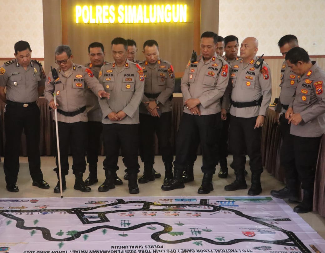MATAHUKUM.ID/SIMALUNGUN –- Aula Andar Siahaan di Mapolres Simalungun tampak penuh sesak pagi itu. Puluhan perwira dan Kapolsek dari berbagai wilayah duduk rapat memperhatikan paparan strategi pengamanan Natal dan Tahun Baru. Di depan ruangan, sebuah maket skala besar menggambarkan peta wilayah Simalungun lengkap dengan titik-titik pengamanan strategis. Inilah Tactical Floor Game (TFG), simulasi lapangan untuk memastikan Operasi Lilin Toba 2025 berjalan sempurna.