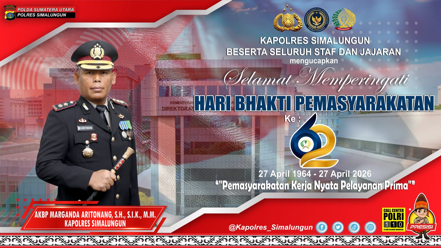 MATAHUKUM.ID/SIMALUNGUN -— Sebagai bentuk nyata komitmen Polri dalam melayani masyarakat secara humanis dan berintegritas, Polres Simalungun Polda Sumatera Utara turut menyampaikan ucapan selamat memperingati Hari Bhakti Pemasyarakatan ke-62 yang jatuh pada Senin, 27 April 2026. Momen bersejarah ini menandai perjalanan panjang institusi pemasyarakatan Indonesia sejak 27 April 1964 hingga 27 April 2026, dengan mengusung tema “Pemasyarakatan Kerja Pelayanan Prima”.