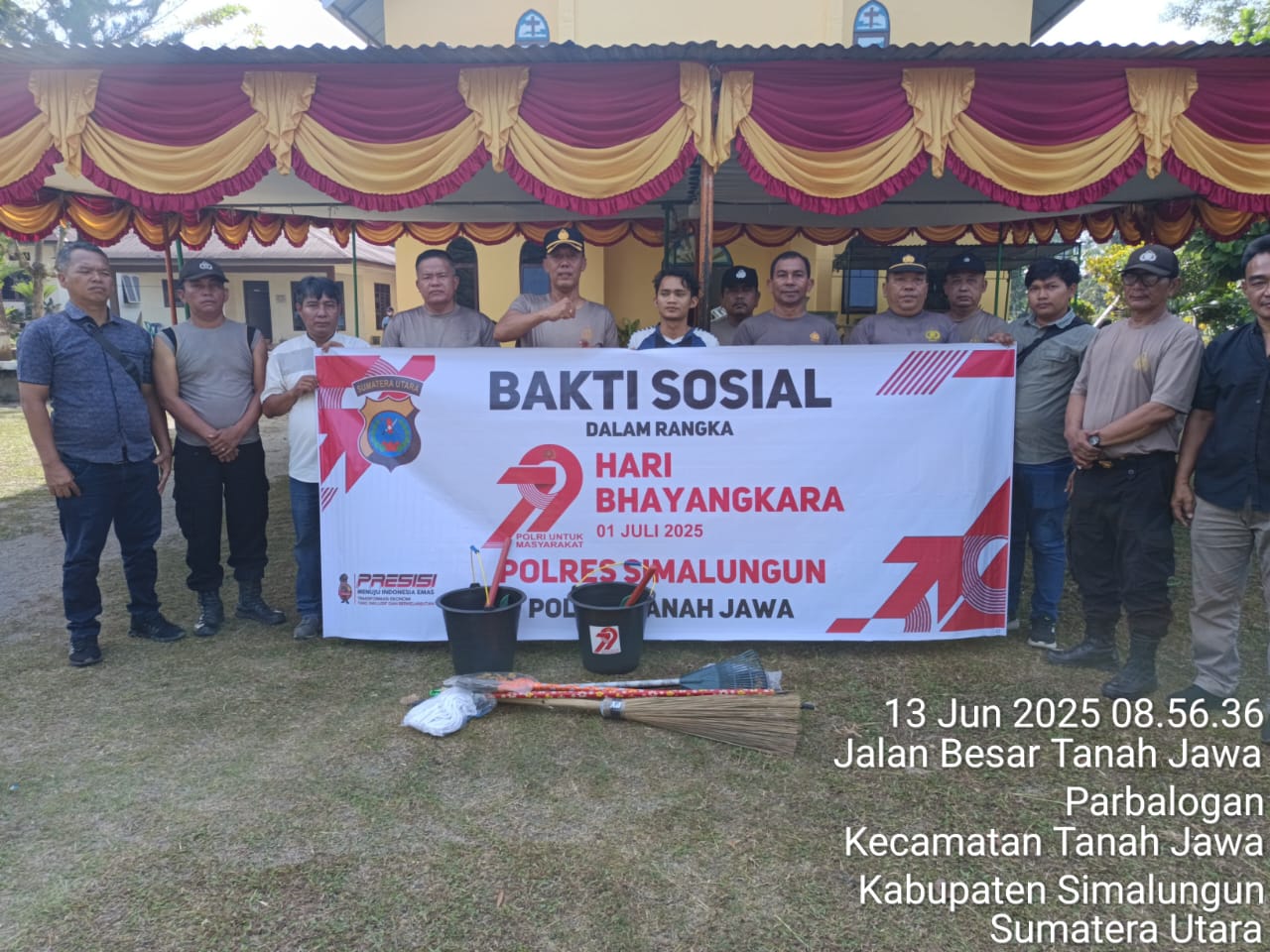MATAHUKUM.ID/SIMALUNGUN — Kapolsek Tanah Jawa Kompol Asmon Bufitra, S.H., M.H. bersama personil Polsek Tanah Jawa melaksanakan kegiatan bakti sosial berupa kerja bakti dan pemberian alat-alat kebersihan di rumah ibadah dalam rangka memperingati HUT Bhayangkara ke-79 yang akan jatuh pada 1 Juli 2025. Kegiatan ini dilaksanakan pada Jumat (13/6/2025) mulai pukul 08.30 WIB hingga selesai.