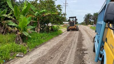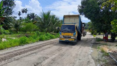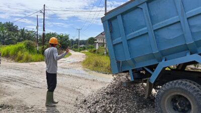 Setibanya dijalan Datuk Lima Puluh material kerikil di turunkan dan langsung diratakan oleh Geleder tersebut. Selasa, 30 September 2025.
