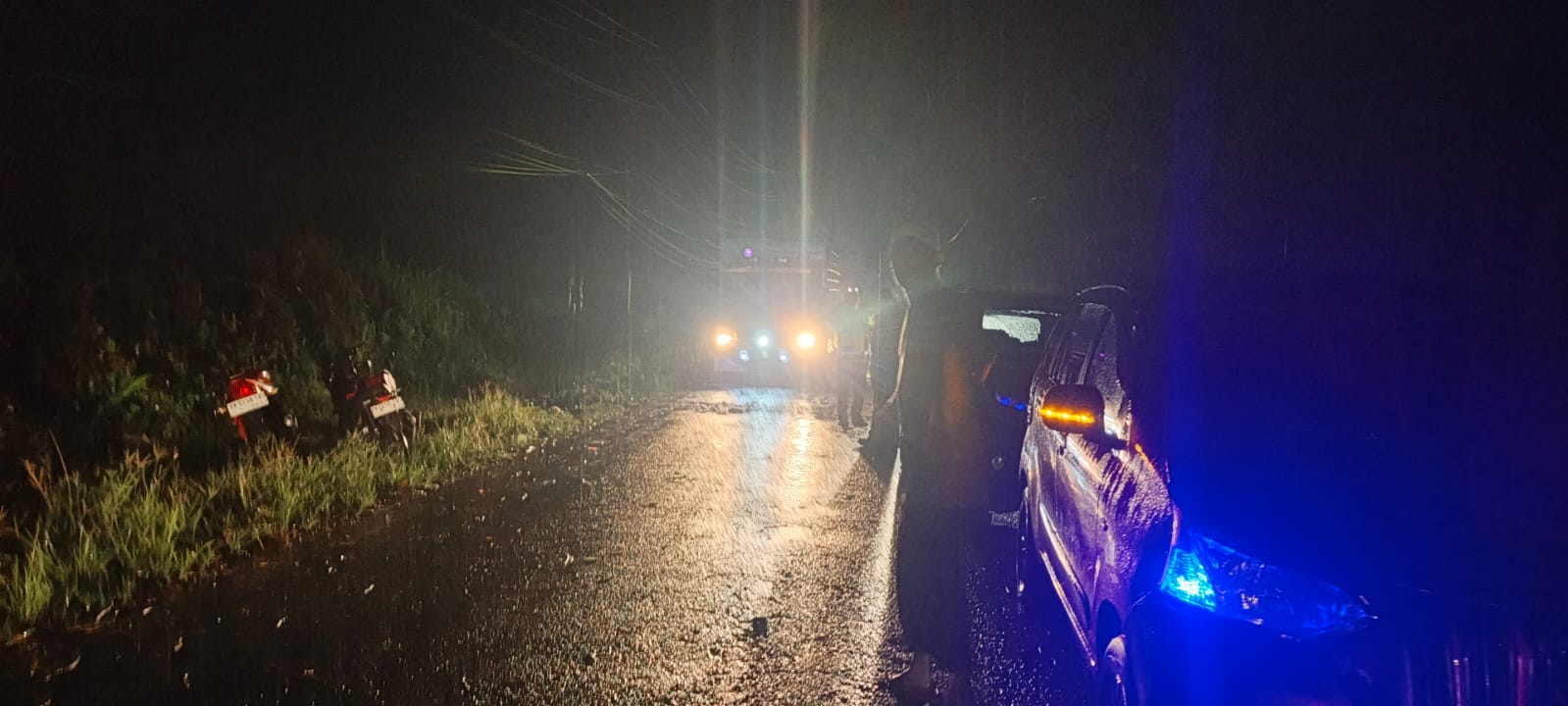 Kejadian yang dilaporkan warga sekitar pukul 21.45 WIB ini langsung mendapat penanganan serius dari jajaran Polsek Tanah Jawa. Dua pohon besar tumbang menutupi badan jalan akibat angin kencang, mengancam keselamatan pengguna jalan dan melumpuhkan arus lalu lintas di jalur vital penghubung Pematangsiantar-Tanah Jawa.