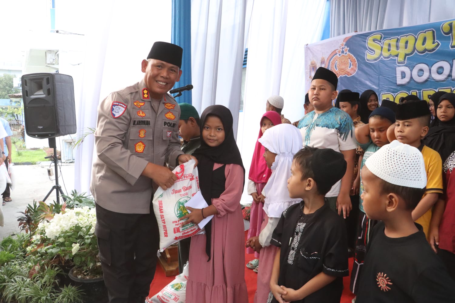 Kapolres AKBP Marganda Aritonang menyampaikan sambutan yang sangat menyentuh. “Kapolres mengucapkan syukur ke hadirat Tuhan Yang Maha Esa atas karunia-Nya sehingga bisa berkumpul dalam rangka Sapa Ramadan Door to Door yang dirangkai dengan buka puasa. Beliau menekankan bahwa kegiatan ini adalah momentum untuk mempererat tali silaturahmi dengan masyarakat, khususnya anak-anak yatim,” ungkap AKP Verry.