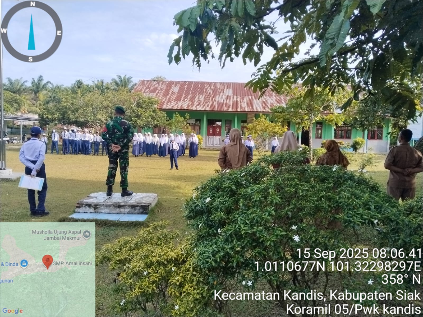 KANDIS – MATAHUKUM.ID – Babinsa Kampung Jambai Makmur Serda Roni Panjaitan menjadi pembina upacara penaikan Bendera merah putih di Lapangan SMPS Amal Insani Dusun Lubuk Raya Kampung Jambai Makmur Kecamatan Kandis Kabupaten Siak, Senin, 15 September 2025.