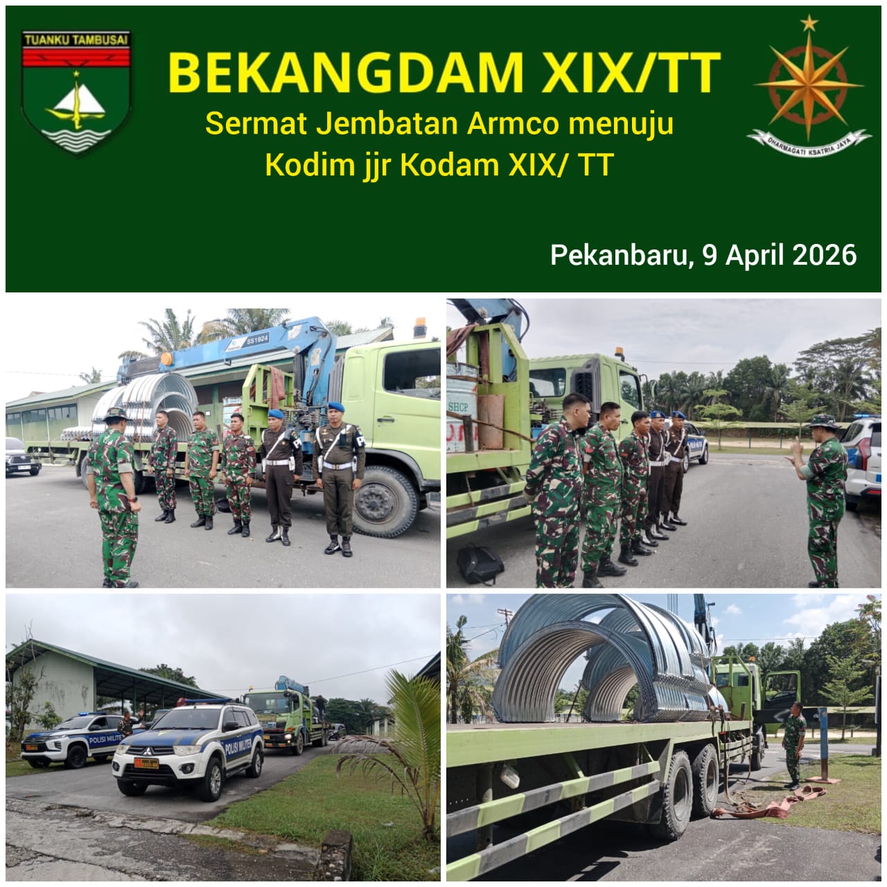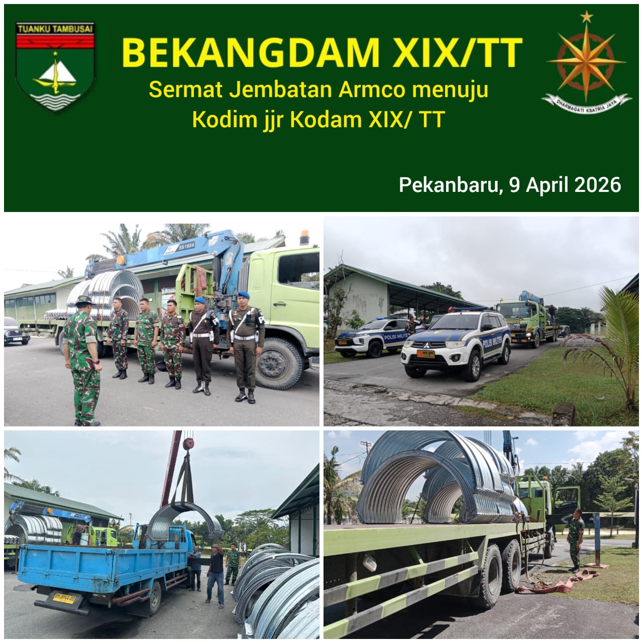 Pekanbaru – Matahukum.id – Dalam rangka mendukung percepatan pembangunan infrastruktur di wilayah teritorial, Kodam XIX/Tuanku Tambusai melaksanakan kegiatan pergeseran material (Sermat) Jembatan Armco menuju sejumlah lokasi pembangunan di jajaran Kodim. 9 April 2026.
