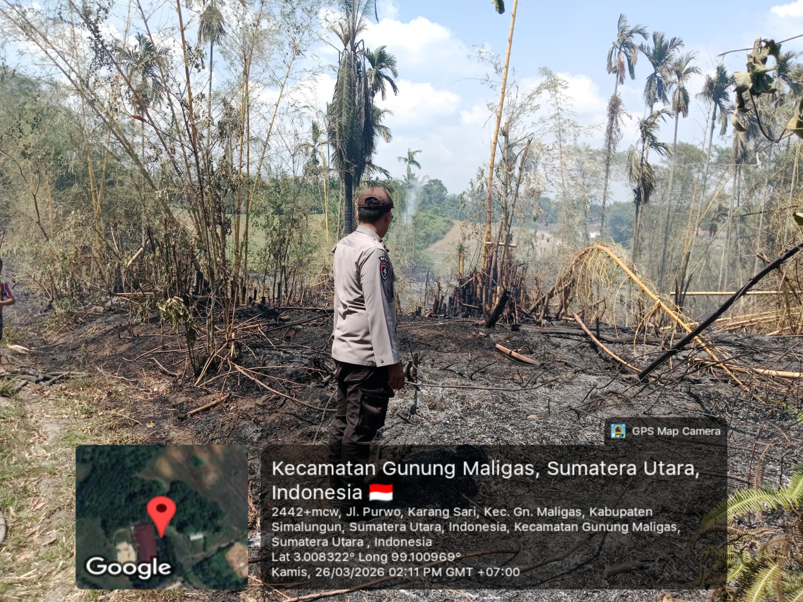 “Peristiwa kebakaran lahan ini terjadi pada Kamis siang sekira pukul 13.30 WIB di area bekas tempat kremasi di Huta IV, Nagori Karang Sari, Kecamatan Gunung Malela. Personel kami langsung bergerak cepat menuju lokasi begitu menerima informasi tersebut,” ujar AKP Verry Purba.