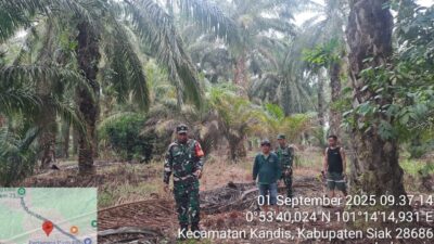 KANDIS – MATAHUKUM.ID – Babinsa Koramil 05/Pwk Kandis yaitu Peltu Rahman S dan Sertu Andi Satria melaksanakan kegiatan patroli karhutla, hari ini memasuki wilayah Kampung Libo Jaya Kecamatan Kandis Kabupaten Siak, Riau. Senin, 1 September 2025.