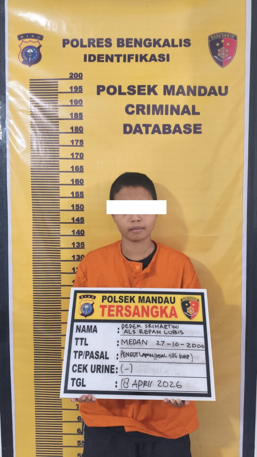 Berdasarkan laporan polisi dan hasil penyelidikan, tim Opsnal Polsek Mandau mendapatkan informasi keberadaan pelaku. Pada Sabtu, 18 April 2026 sekitar pukul 11.30 WIB, pelaku berhasil diamankan di Jalan Lingkar Simpang 4, Desa Air Jamban, Kecamatan Mandau.
